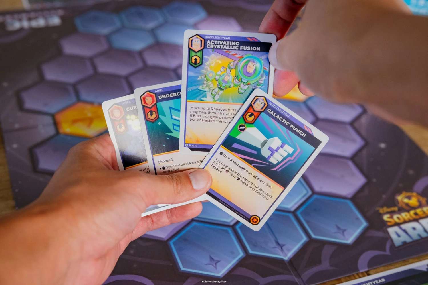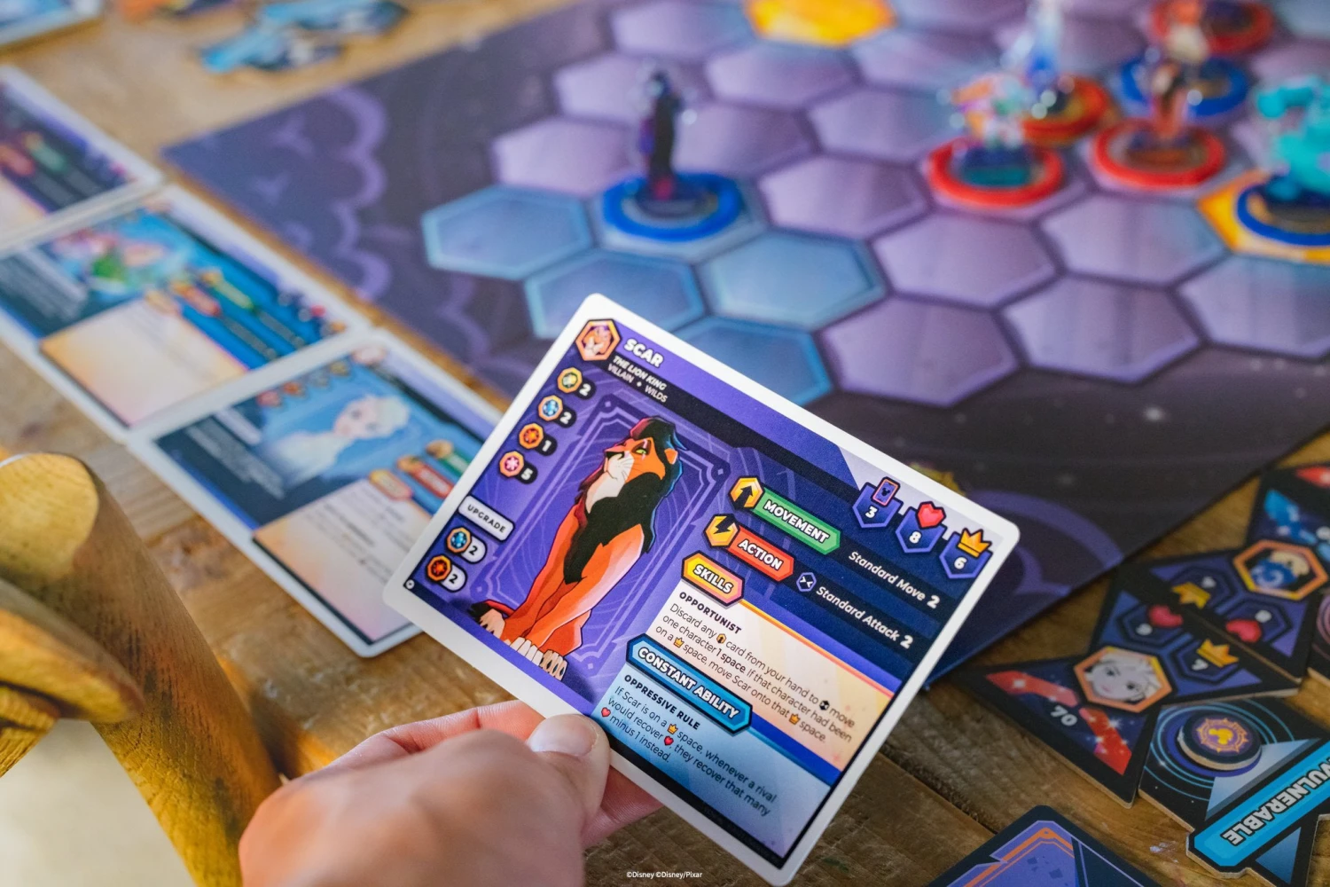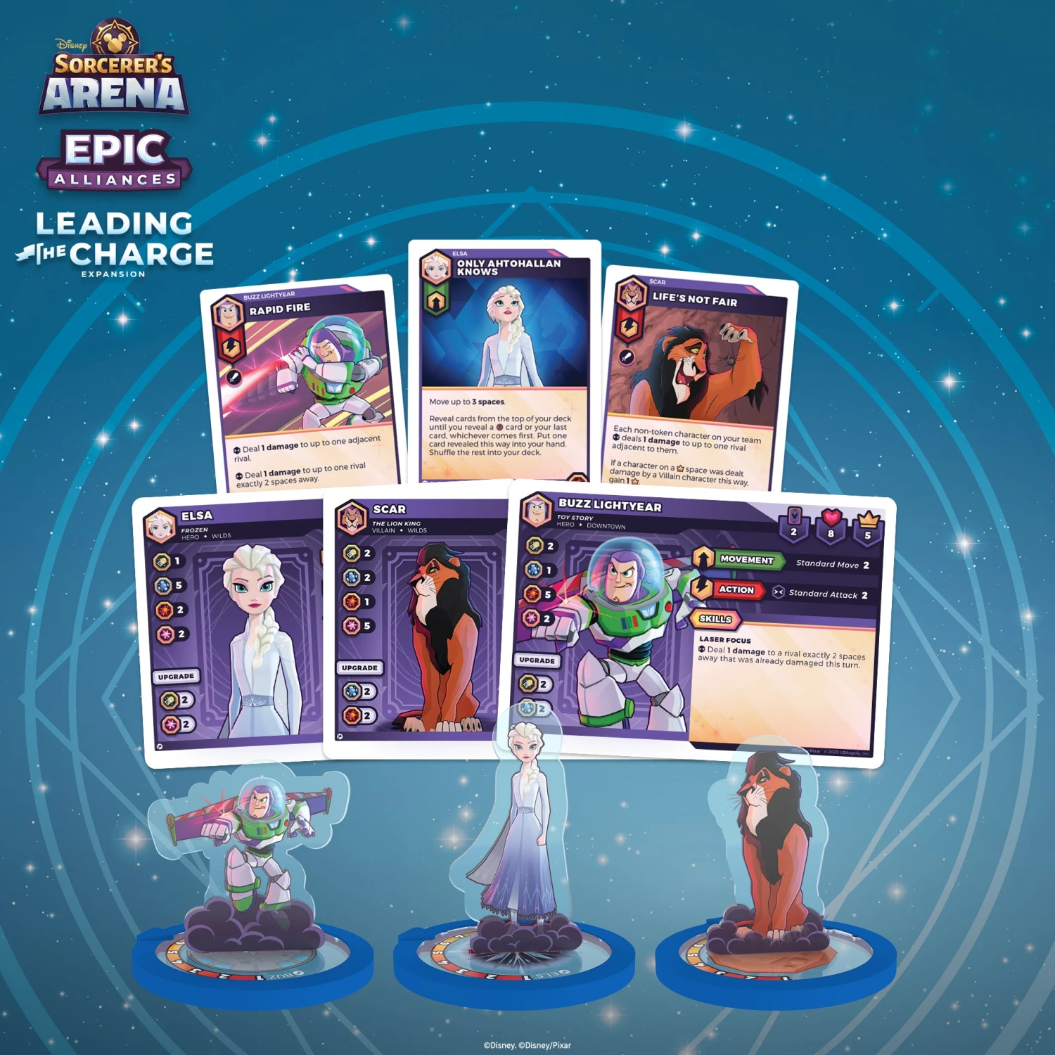 Take your combat skills in Disney Sorcerer’s Arena: Epic Alliances to all new levels with this game-changing expansion pack! Elsa, Buzz Lightyear, and Scar bring new attacks and abilities true to their characters that will take command in the Arena’s already epic battles. Amplify magical effects with Elsa, engage Buzz’s laser focus, and control VP spaces with Scar. Disney Sorcerer’s Arena: Epic Alliances is the ultimate PvP tabletop game for Disney and Pixar fans and gamers where players can build teams out of Disney and Pixar heroes and villains and compete in an expandable, learn-as-you-go battle arena game.