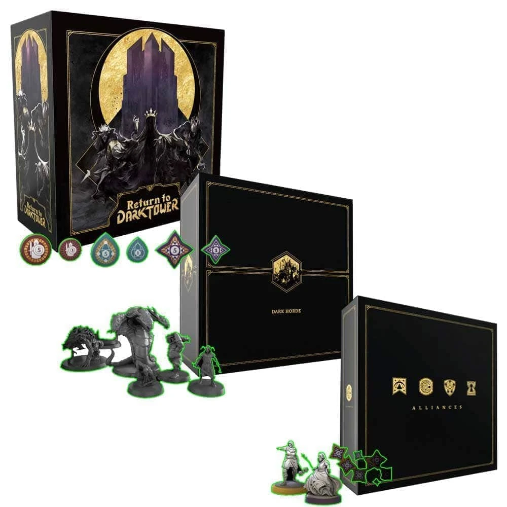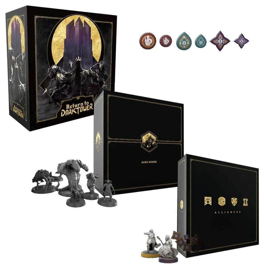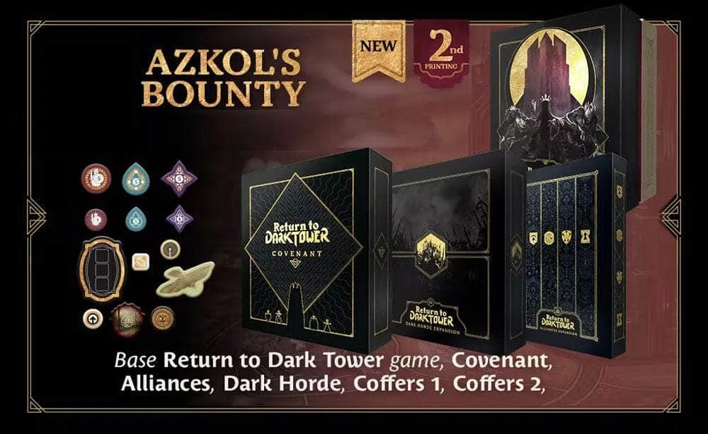 Content Notes: Kickstarter Return To Dark Tower: NEW Azkol’s Bounty Pledge! Return to Dark Tower Core Game, Alliances Advanced Game Expansion, Dark Horde Miniatures Pack, The Coffers Token Upgrade, NEW Covenant Expansion, NEW Coffers 2 Expansion, and All Applicable Unlocked Stretch Goals. Please note: unless otherwise stated paid add ons from the Kickstarter Campaign are not included.