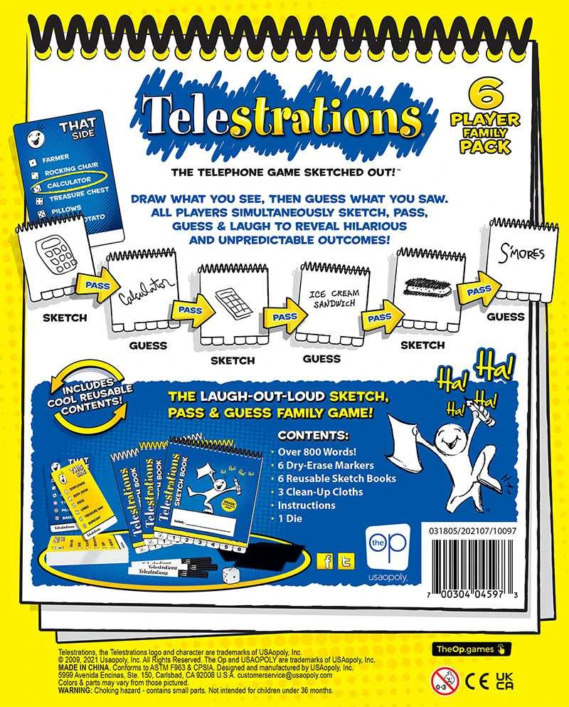 The award-winning party game Telestrations will get your family and friends laughing as they draw what they see, then guess what they saw for hours of hilarious miscommunication. All players simultaneously sketch, pass and guess while revealing laugh out loud and unpredictable outcomes!