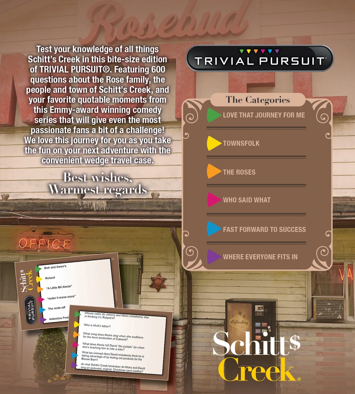 Embrace joy for once and relive the Rose Family’s best and worst moments with TRIVIAL PURSUIT®: Schitt’s Creek! Flaunt your knowledge of the Emmy Award-winning comedy’s characters, quotes, locations, and more with 600 questions from six categories: Love That Journey For Me, Townsfolk, The Roses, Who Said What, Fast Forward to Success, and Where Everyone Fits In. Answer correctly to claim the card and be the first with six to win! Portable wedge case makes this quick-play game easy to pack for last-minute moves and motel room entertainment.